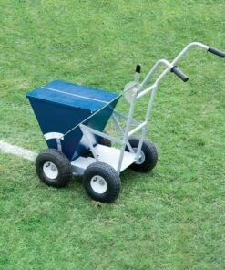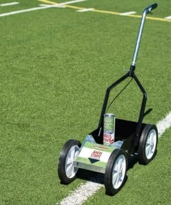 This AlumaGoal 4-Wheel Line Marker has a capacity of up to 50 lbs, is a cheaper option at a smaller size, and allows groundskeepers to paint precise lines. This line marker is constructed from an 11-gauge steel from, an 18-gauge galvanized steel bucket, and steel axle bushings. Its four tires are pneumatic, measure at a width of 3.5 inches by a diameter of 10 inches, and allow the marker maneuver easily across playing fields. The marker also has adjustable settings, allowing a groundskeeper to switch between two inch and four inch lines. This line marker is perfect for any school, sports facility, or association, and has a warranty of 18 months.