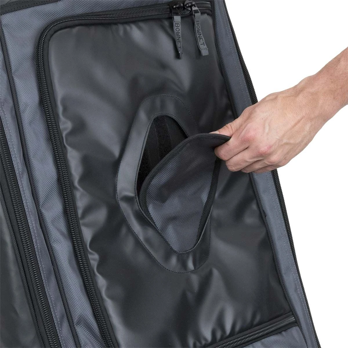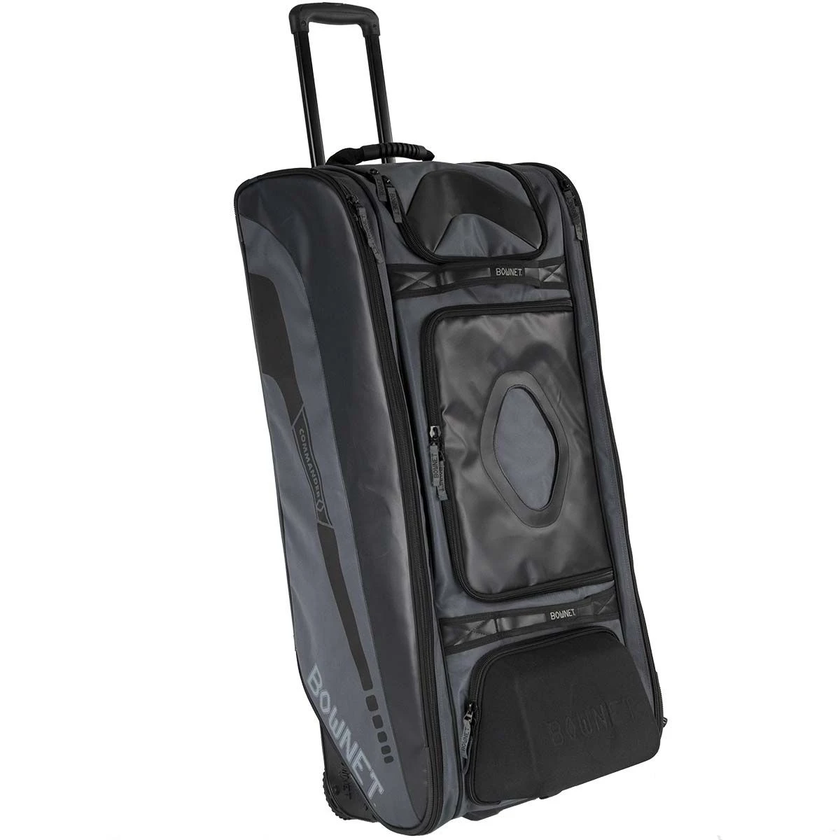 The Bownet Commander wheeled catcher’s equipment bag is designed for travel ball, high school and adult catchers who need the ultimate catcher’s bag. Measuring 38” H x 17” W x 12 D”, the Commander features 14 different pockets to store and carry all of your catcher’s gear including bats, uniform, helmet, jackets, and accessories, all in one bag. The Commander’s durable Big Trax™ wheels are equipped with rubber treads for quiet easy transport over grass, gravel or road. 3 big barrel full size bats fit on the side bat panel pocket. The Commander is outfitted with a molded semi-hard case for your helmet or cleats. Top it off with a removable personalization panel for your name, number or team name.