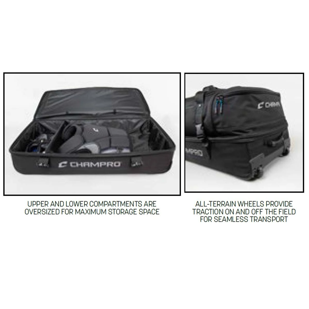 The catcher/umpire wheeled equipment bag from Champro measures 36” L x 16” W x 17” H and is made of water-resistant 600D polyester for use in all conditions. The oversized design allows you to store all of your umpire gear in the separate upper and lower zipper compartments for easy access and organization. Both sides of this bag feature a vented zippered pocket for additional personal gear and shoe storage, keeping items fresh and odor free. On the inside, the internal personal organizer and detachable divider is ideal for customizing the storage space to match the size of your equipment. The front exterior pocket is designed for quick access for items like pitch counters and other small accessories. Transporting this equipment bag is a breeze, whether you’re lifting it with the sturdy wrap-around handles or pulling it with the durable all-terrain wheels.