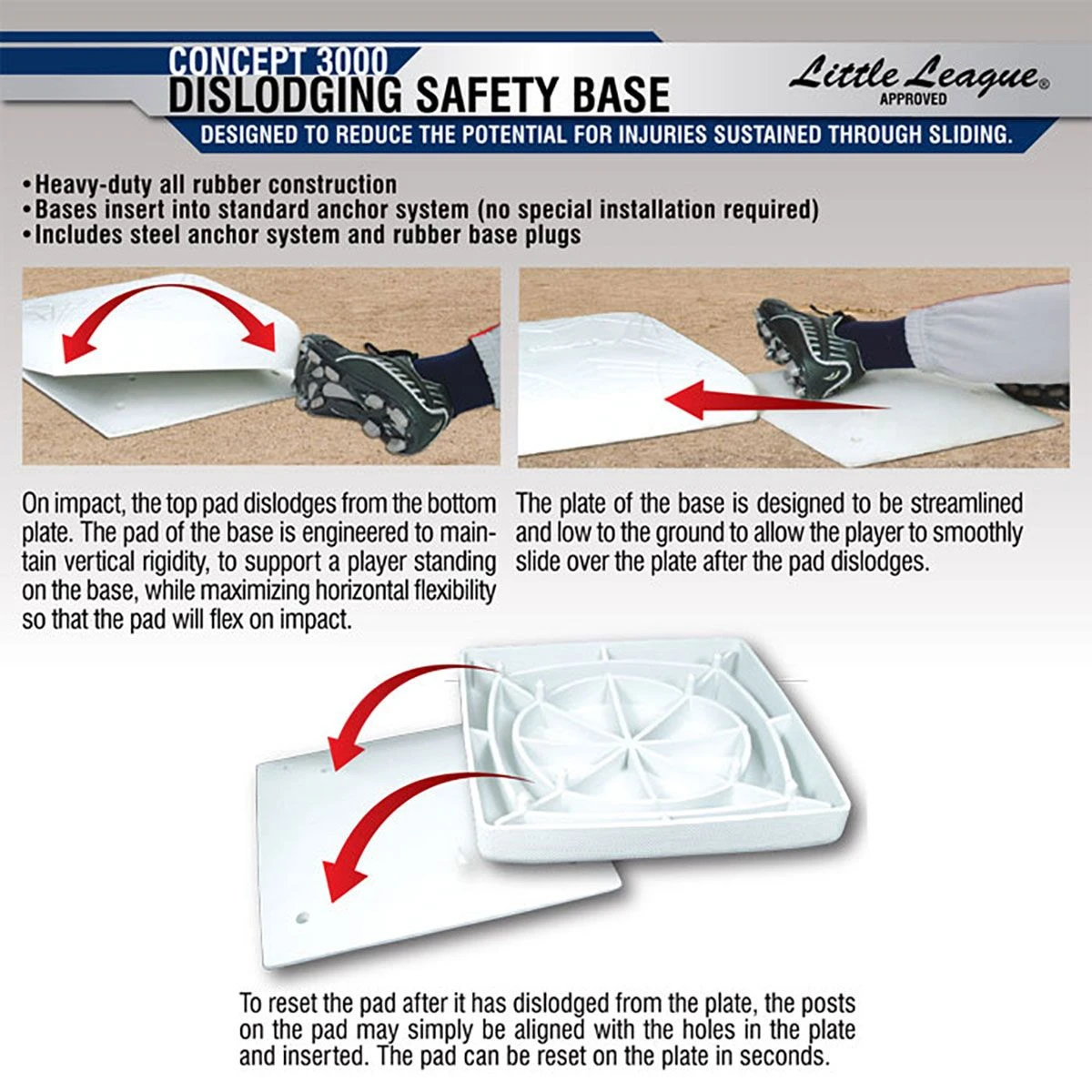 The dislodging double first base from Champro is designed to reduce potential injury for sliding injuries and allow umpires to make calls as the play progresses. The heavy-duty all rubber pad is strong enough to support a player standing on the base, but flexes and dislodges from the smooth bottom plate as players slide in. Within seconds, the top pad can be reset back onto the bottom plate when the play is complete. The 15″ x 30″ double first base features a white base for fielders and a bright orange base for baserunners to reduce injury from collisions. This base includes a steel double anchor system and 2 base plugs and is compliant with Little League® rule 7.15.