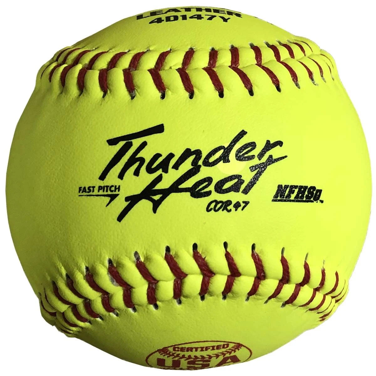 This is a set of 6 Dudley Thunder Heat 12″ leather softballs with .47 COR, 375 lbs compression and a poly center. The Thunder Heat 4D147YR6 oftballs are dual stamped with both USA Softball and NFHS certifications. These fastpitch balls are built for exceptional performance and durability, utilizing a premium leather cover with a precision blended, cross-linked polyurethane center for high density and maximum resiliency.
