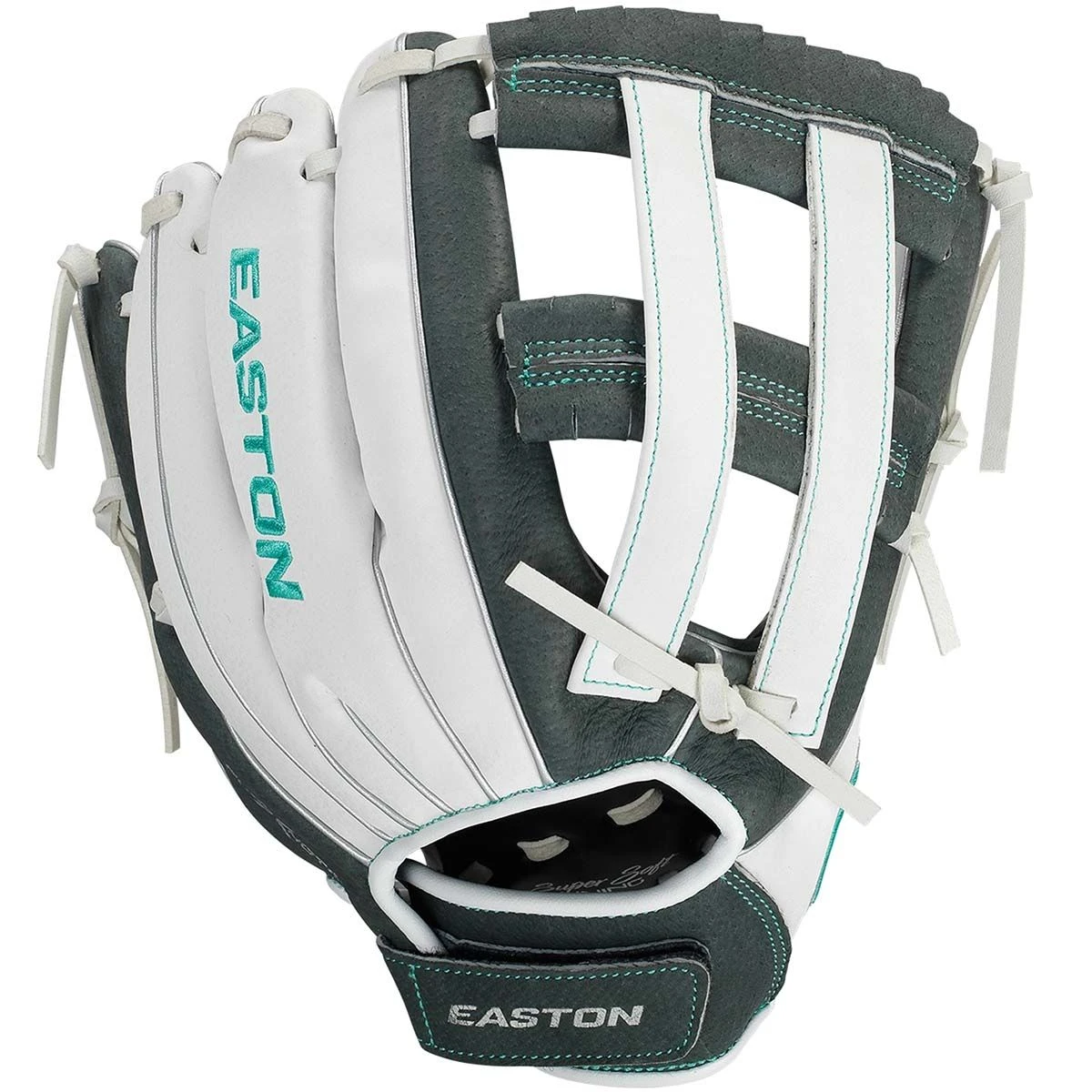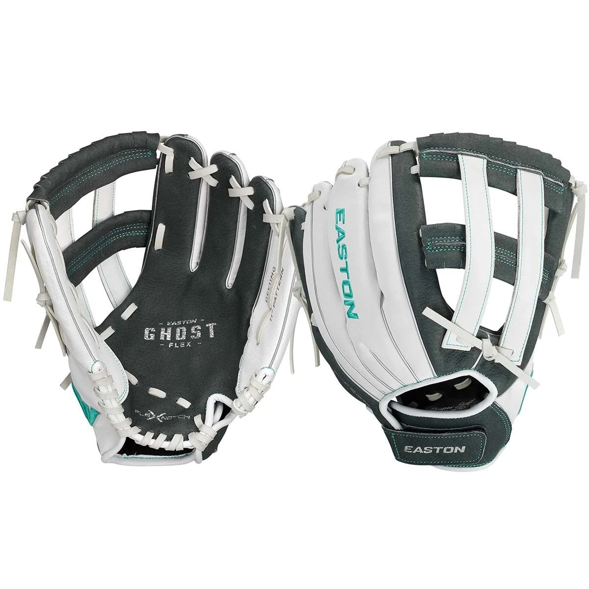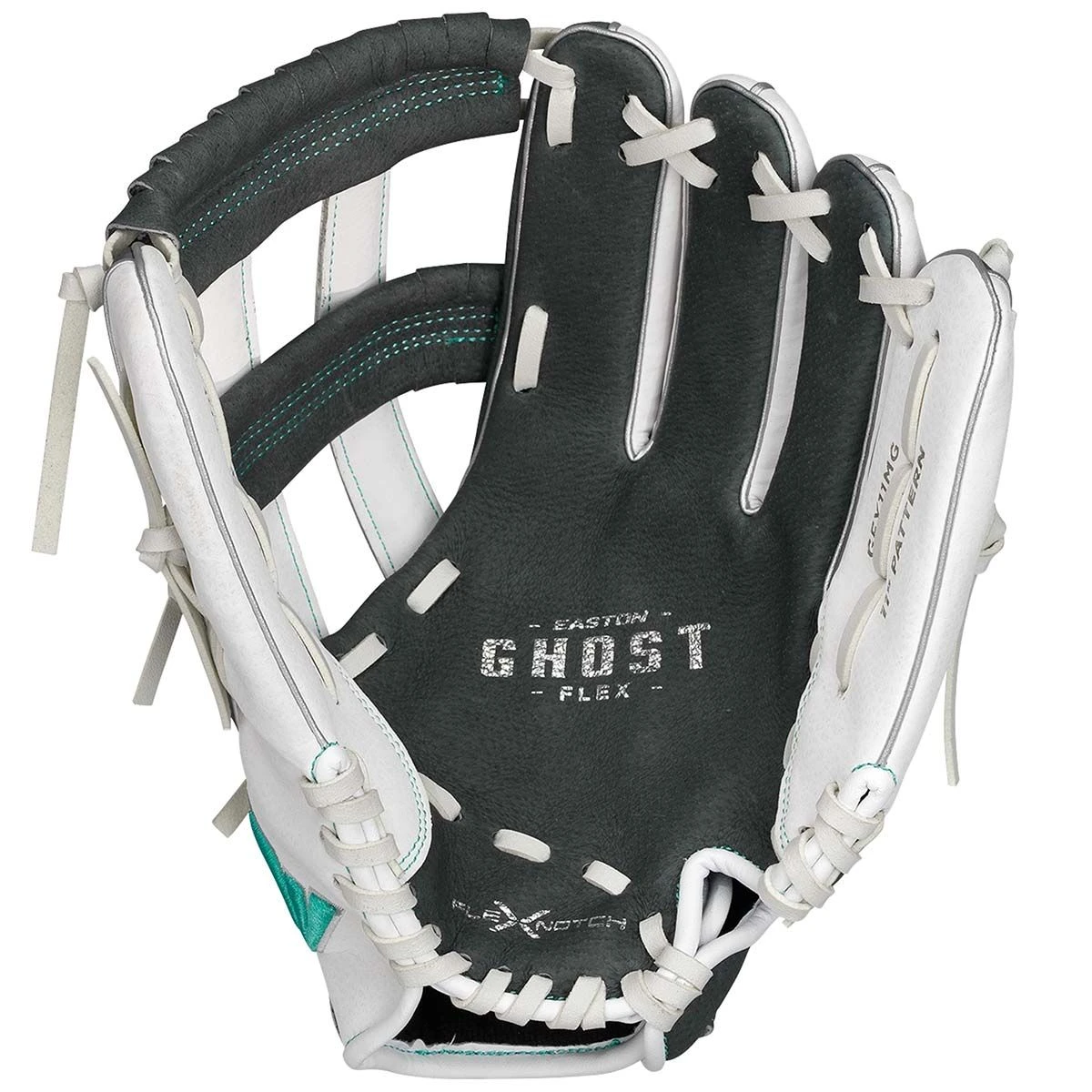 The Easton Ghost Flex is designed for beginner fastpitch softball players. This 11″ youth model features soft genuine pigskin leather combined with embossed Hyperlite synthetic leather to provide a lightweight feel. The Flex Notch™ system allows the pocket to close easier, and extended finger gussets provide a better fit and leverage. Players will have better grip and control from the super soft palm lining, The Lock Down wrist strap design easily adjusts for the perfect fit.