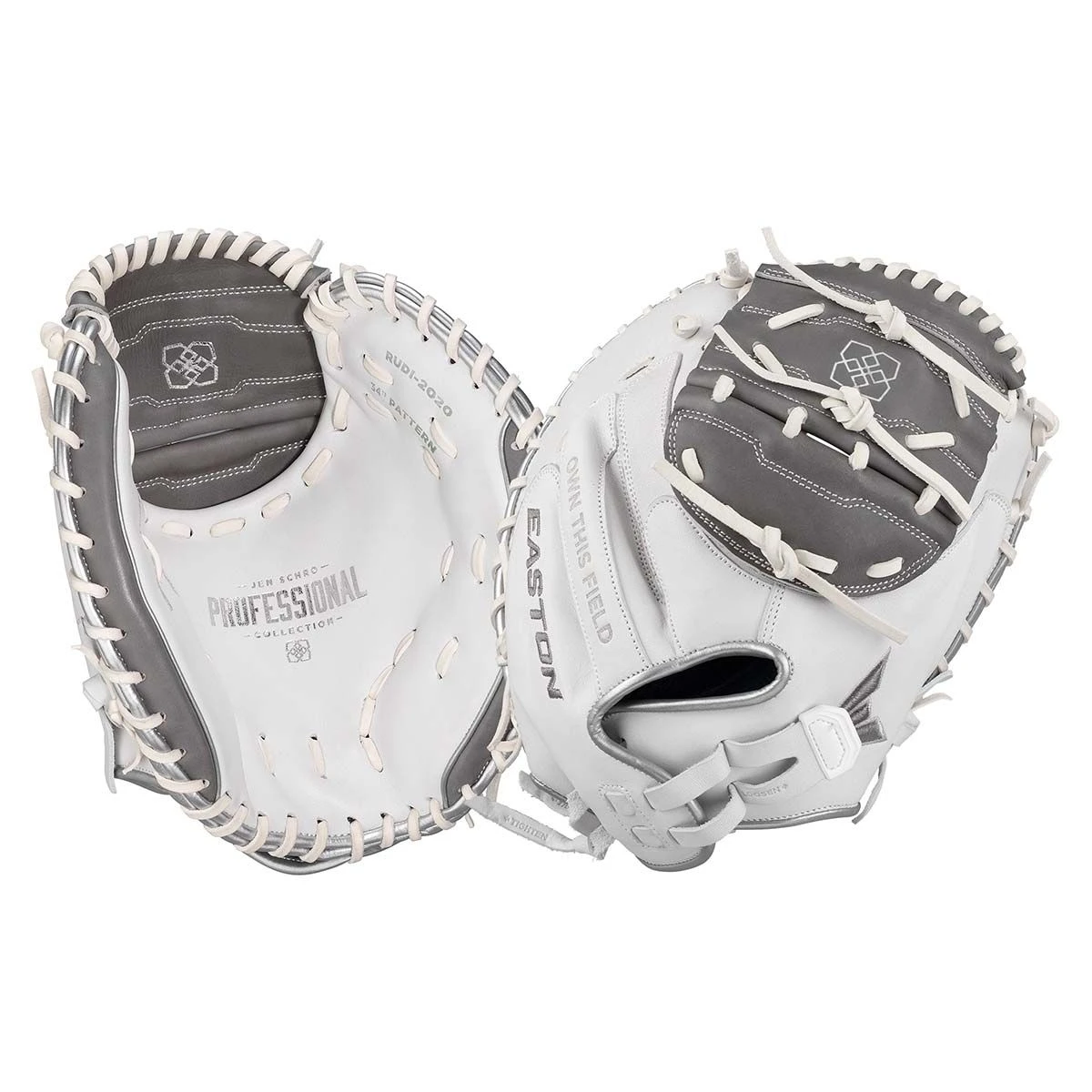 The Easton RUDI-2020 Professional Signature fastpitch catcher’s mitt has fastpitch-specific patterns, making it perfect for high level softball catchers. The 34″ mitt is constructed of Premium Reserve™ USA steer hide leather with a classic cowhide palm lining for maximum comfort, and steerhide binding for enhanced durability. This glove also features a rolled leather welting system for an expedited break-in process as well as a water-resistant Ax® Suede microfiber wrist liner for breathability.