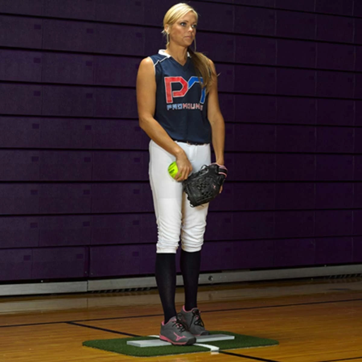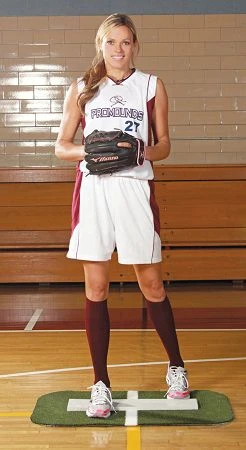 The Jennie Finch Mini softball pitching mat is ultra portable and affordable! A center line easily aligns with the existing gym floor lines for precise training.