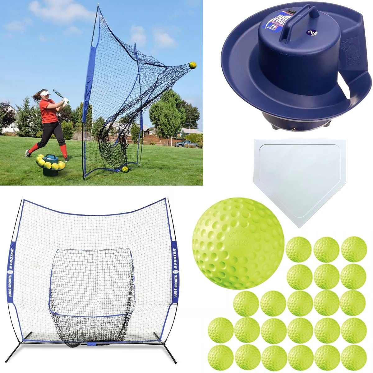 The portable Jugs softball toss hitting package has everything you need to practice hitting anywhere. The Jugs toss machine tosses a ball every 5 seconds, allowing for hundreds of swings in less than half an hour. With an internal rechargeable battery, the toss machine can run for up to 8 hours of continuous use and hold up to 10 softballs. The toss machine comes with a 24-page drill book, providing players with various methods for improving their swing. The 8 foot travel screen serves as a portable solution for collecting hit balls and can be easily set up and taken down. The travel screen is perfect for tee practice, toss practice or soft toss practice and comes complete with a heavy-duty 43” nylon travel bag. The included throw-down home plate can be placed anywhere to simulate a realistic batting situation. 2 dozen dimpled sting-free softballs are included to allow for drills without interruption.