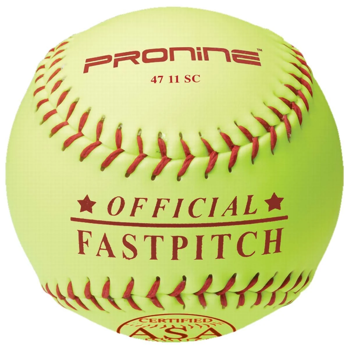 The Pro Nine 11″ 11 SC synthetic fastpitch softball is approved for play in ASA/USA Softball leagues. This 11″ youth fastpitch softball features red stitching, a solid polyurethane core, .47 COR, and 375 lb compression. The synthetic tacky grip cover and raised seams allow for better control on throws.