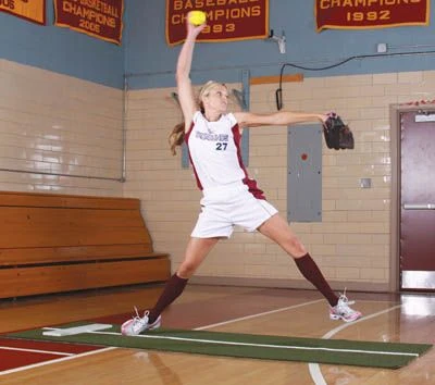 A great softball pitching aid, the Jennie Finch pitching mat comes with a regulation pitching rubber attached. The Power Line mat has a 2″ inlaid white line for more precise training for pitchers of all ages. Each mat comes with a convenient carrying case. The fastpitch pitching mat is made from spike-resistant, extremely durable artificial turf with a special rubberized backing that is guaranteed not to slip on gym floors.