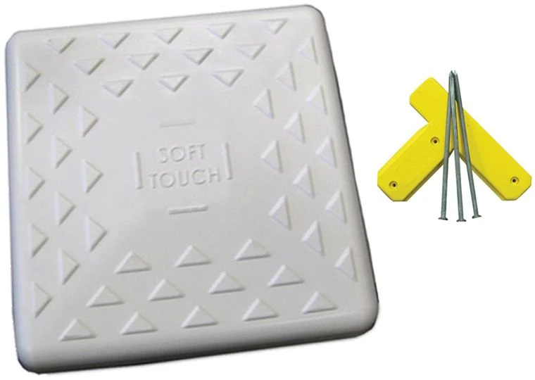 The 15″ spike-down base combines the exclusive Soft Touch base design with a spike-down mounting system that can be installed on any grass or dirt area. Use this base on any field when square Soft Touch ground anchors are not present. Simply drive the spikes through the yellow “T” mounting anchor and quickly mount the base the the anchor. Soft Touch bases flex and absorb energy as a player slides into the base. In the case of uncontrolled slides, the “Progressive Release” action allows the base to flex until enough force is applied to “pop” the base free from the mount, making them much safer than stationary bases.