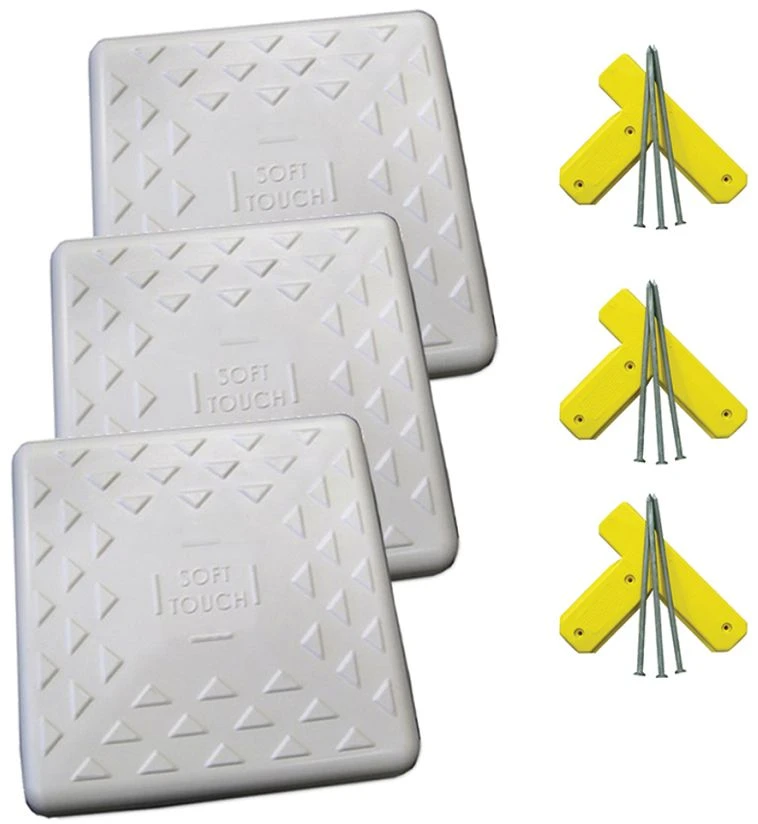 The S-Series base set includes the exclusive Soft Touch base design with a spike-down mounting system that can be installed on any grass or dirt area. The base is designed to flex and absorb energy as a player slides into the base. In the case of uncontrolled slides, the “Progressive Release” action allows the base to flex until enough force is applied to “pop” the base free from the mount, unlike any stationary base.